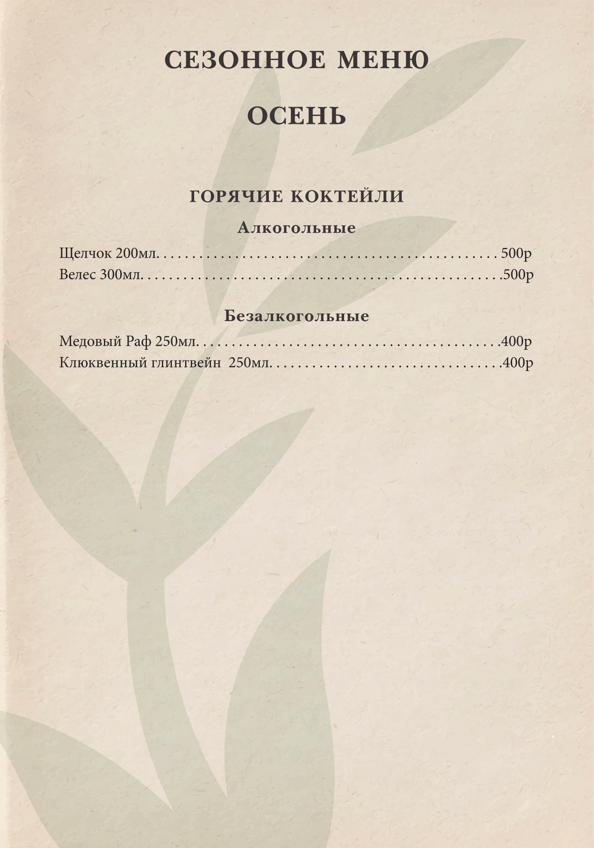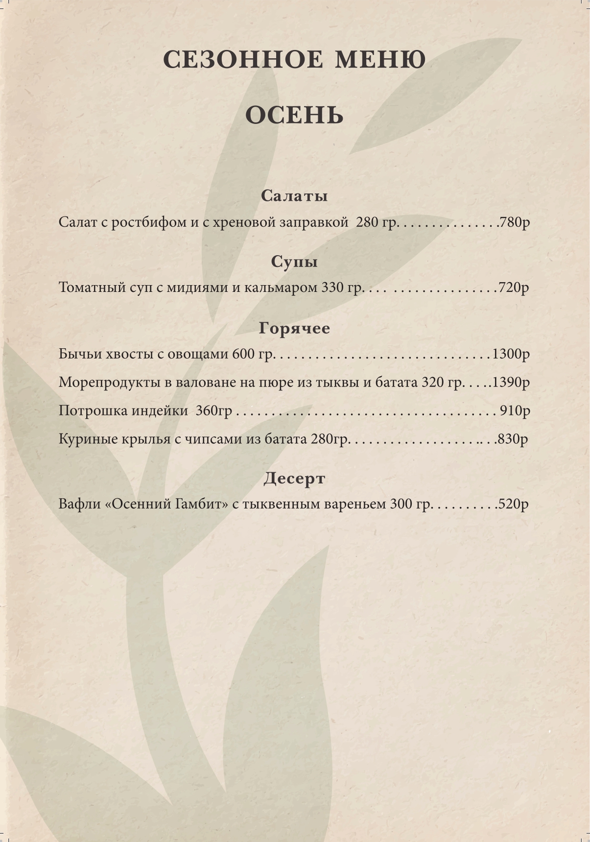 Наш ресторан предлагает своим гостям широкий выбор блюд. Основу нашего меню составляют блюда из русской и европейской кухни. Это хорошо знакомые всем рецепты, которые создадут чувство домашнего уюта и комфорта.